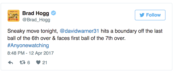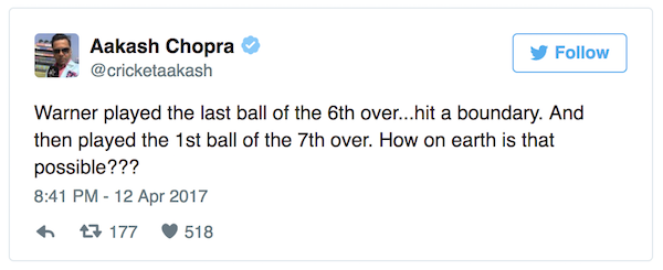 So as per basic the rules of cricket, in the next over Shikhar Dhawan should have taken the strike in the next over. However, it was David Warner who played the first ball of the 7th over again. Mitchell McClenaghan ran in to bowl the over while Warner played it towards the long on-region and took a single.