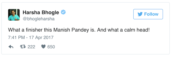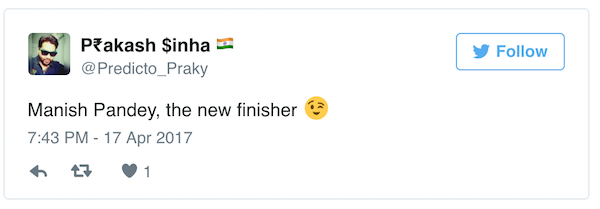 Manish Pandey turned out to be the finisher for Kolkata Knight Riders against Delhi Daredevils as he helped his side chase the target set up by the home team in the last over of the match.
