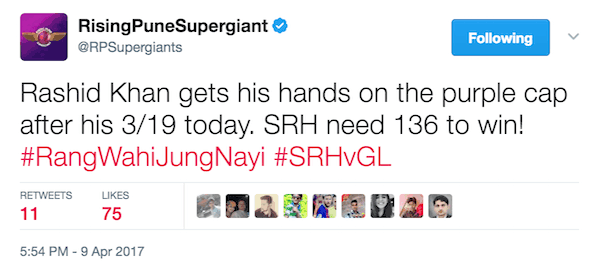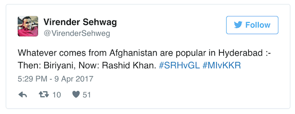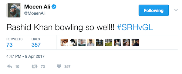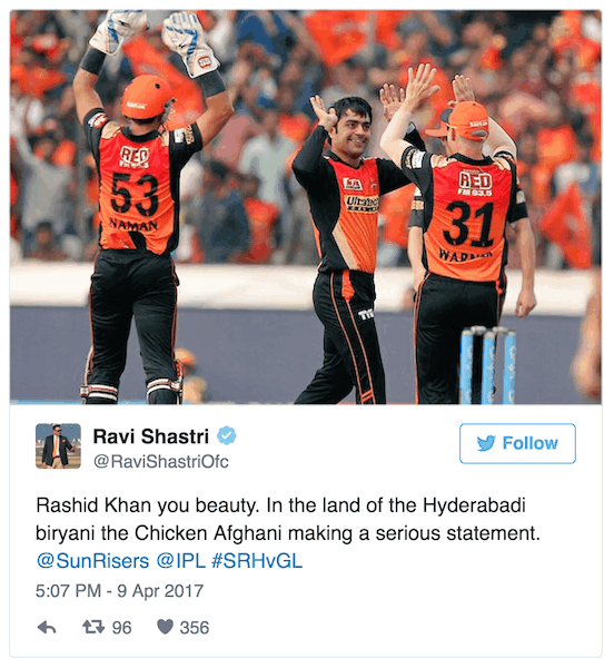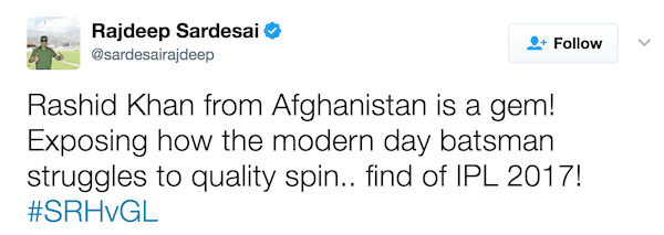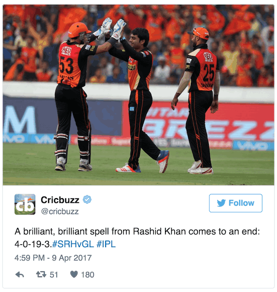 Playing just the 2nd game of his IPL career, Rashid not only showed his class performance with the bowl but also proved his worth in the team. He dismissed star Gujarat Lions batsmen namely Brendon McCullum, Suresh Raina and Aaron Finch.