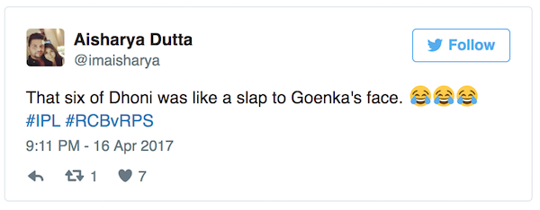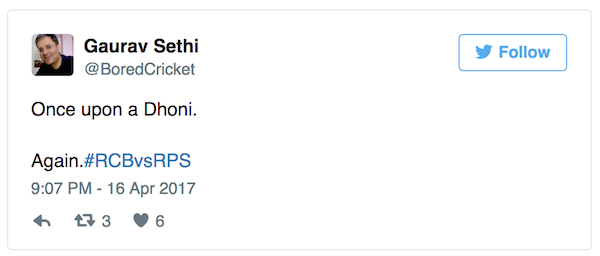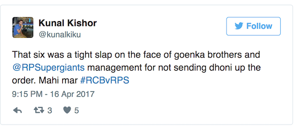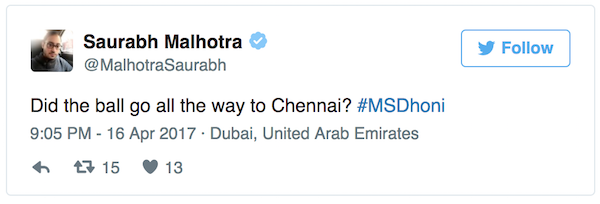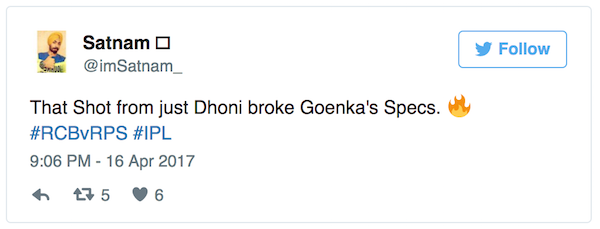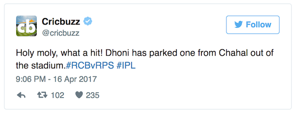 Dhoni came down the track on the bowling of RCB leg-spinner Yuzvendra Chahal and smashed the ball, which went sailing over the stadium to land on the roof.