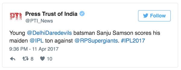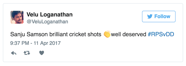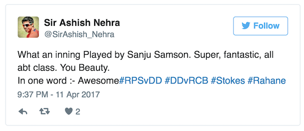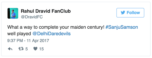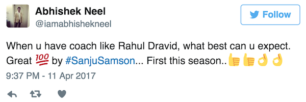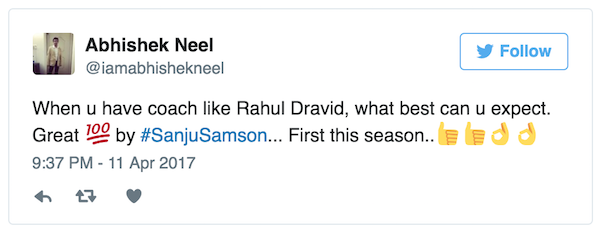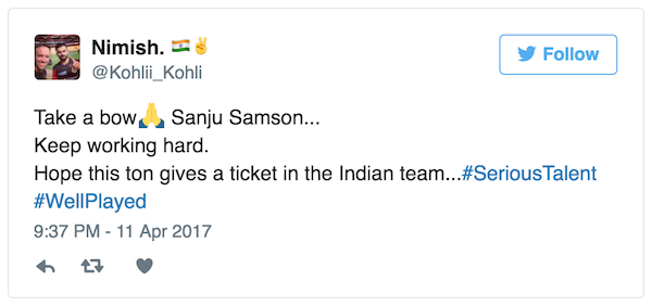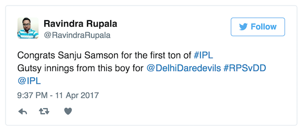 Fans on Twitter erupts as Sanju became the first centurion of IPL 2017 and also the second youngest batsmen after Manish Pandey.