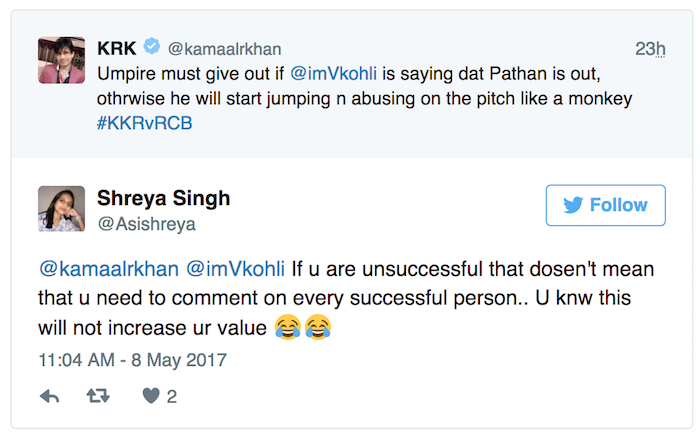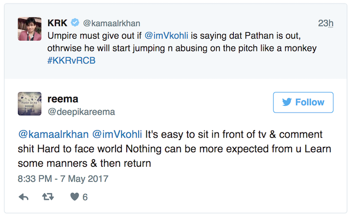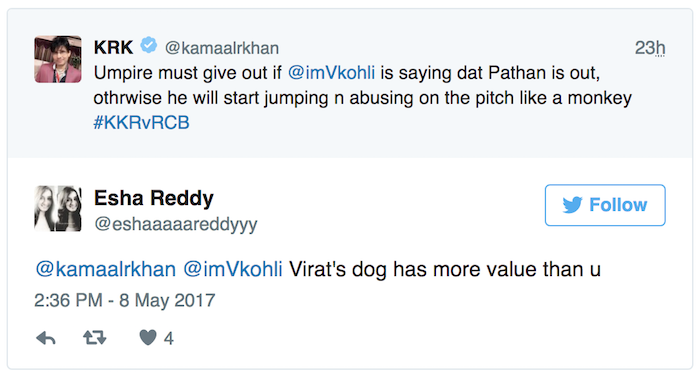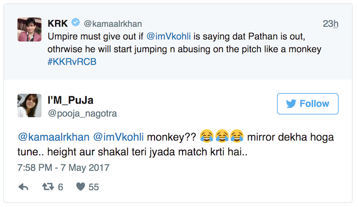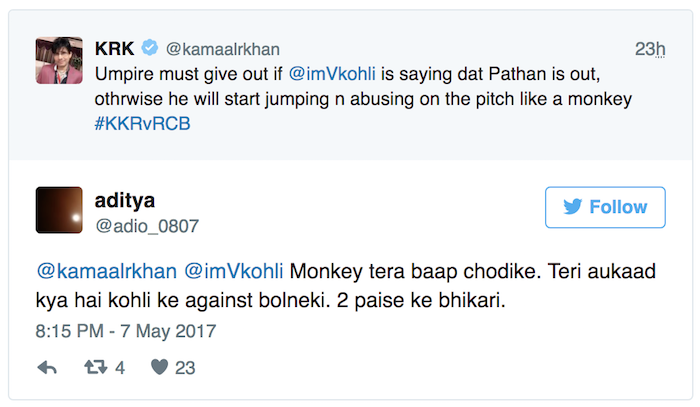 “Umpire must give out if @imVkohli is saying dat Pathan is out, othrwise he will start jumping n abusing on the pitch like a monkey #KKRvRCB”, he commented about Virat.