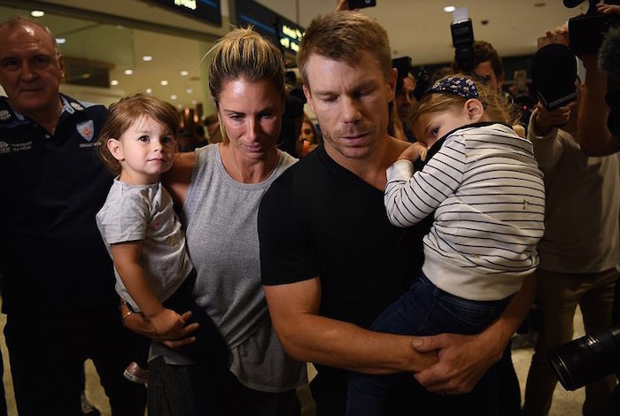 Comforted by his wife Candice and intent on getting his two young daughters to bed, Warner stopped briefly to talk to journalists upon his near-midnight arrival at Sydney airport on Thursday.