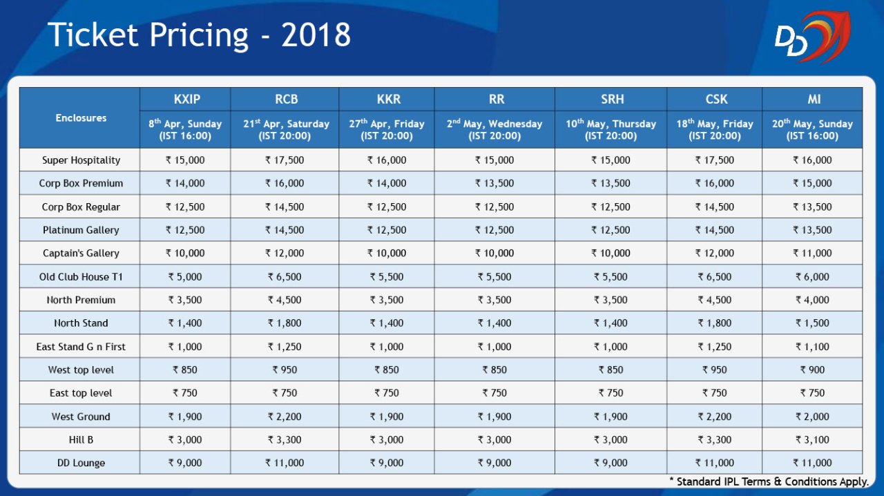 Delhi Daredevils (DD) have released their ticket pricing deck for the 11th edition of the Indian Premier League (IPL). The tickets for the matches featuring Virat Kohli and MS Dhoni will invoke a premium.