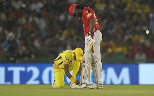 After this Gayle saw his national teammate and CSK all-rounder Dwayne Bravo and told him to tie his shoelaces.