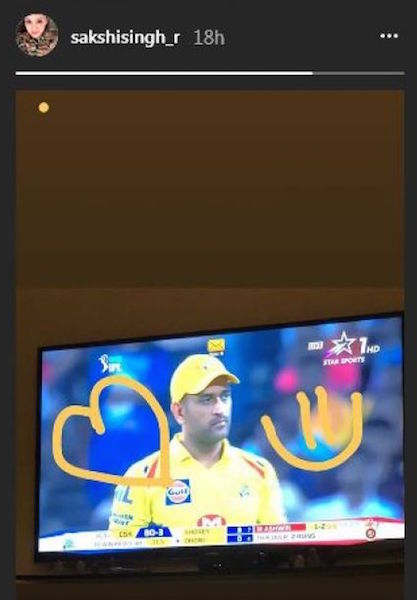 While Sakshi could not make it to CSK’s game against Virat Kohli-led Royal Challengers Bangalore (RCB), she shared an Instagram story of a picture where Dhoni could be seen batting against their arch-rivals.