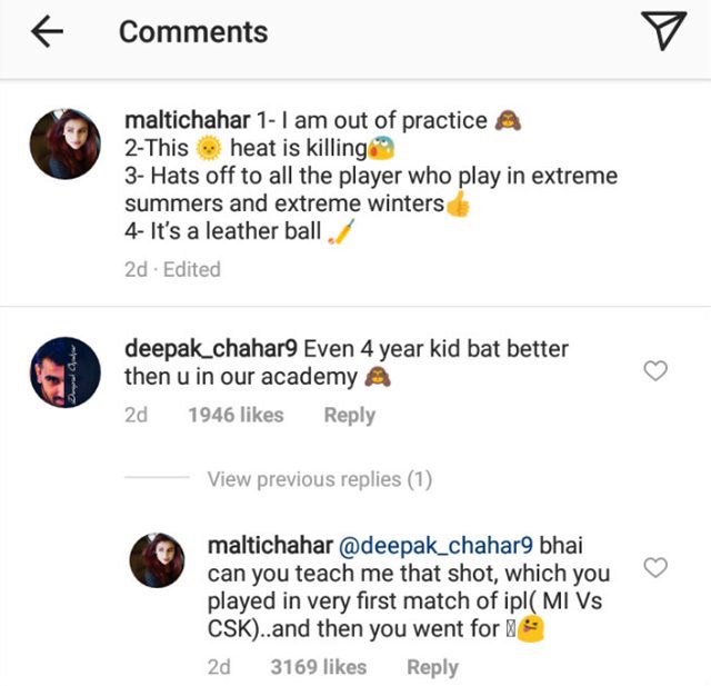 Malti was also ready with a comeback and trolled Deepak back by reminding him of the poor shot he played against the Mumbai Indians in the very first game of the season.