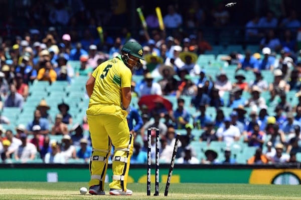 Finch made just six before being bowled – the fifth time in his past eight one-day innings he had been dismissed in that fashion. The Aussie opener aimed a big drive at a fullish Bhuvneshwar Kumar delivery but managed only an inside edge onto his stumps.