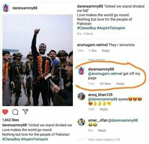 “United we stand divided we fall Love makes the world go round. Nothing but love for the people of Pakistan,” Sammy wrote on Instagram with a picture of himself in Pakistan.