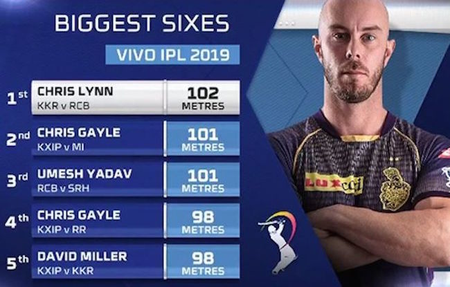 Lynn pipped Chris Gayle to hit the biggest six of the IPL 2019. The 28-year-old smashed a Yuzvendra Chahal delivery in the last over of the powerplay for a 102-meter six.