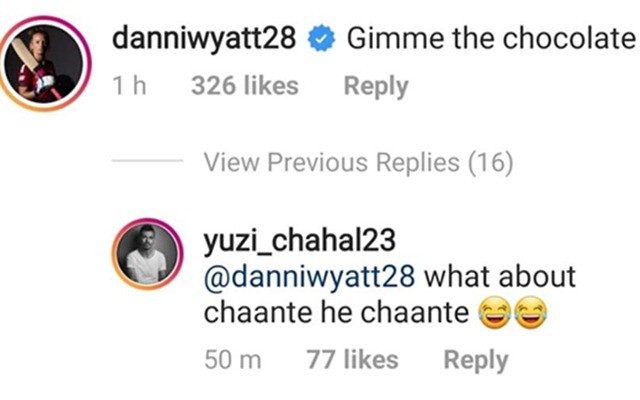 Chahal’s post asked for a caption from his fans and followers. Wyatt commented to the post by saying, “Gimme some Chocolates”. Yuzi, then responded to Wyatt by saying: ‘what about chaante he chaante’.