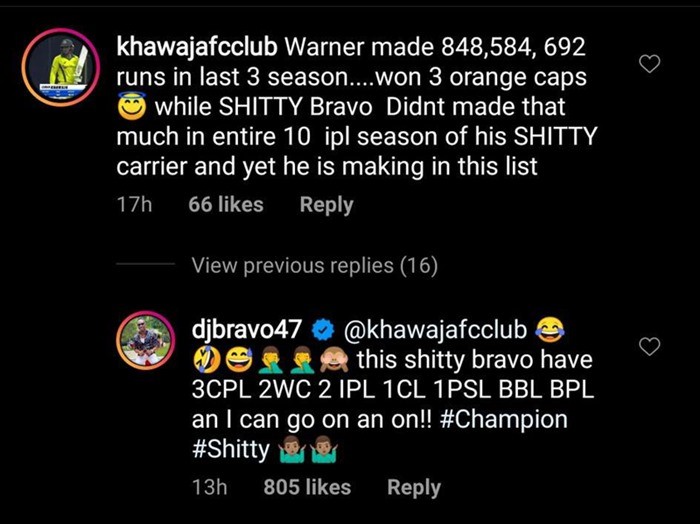 However, one of the trolls went on to criticize Bravo while boasting the numbers of Warner in the Indian Premier League (IPL). Also, the troller used an urban slang to describe the Trinidadian’s credentials.