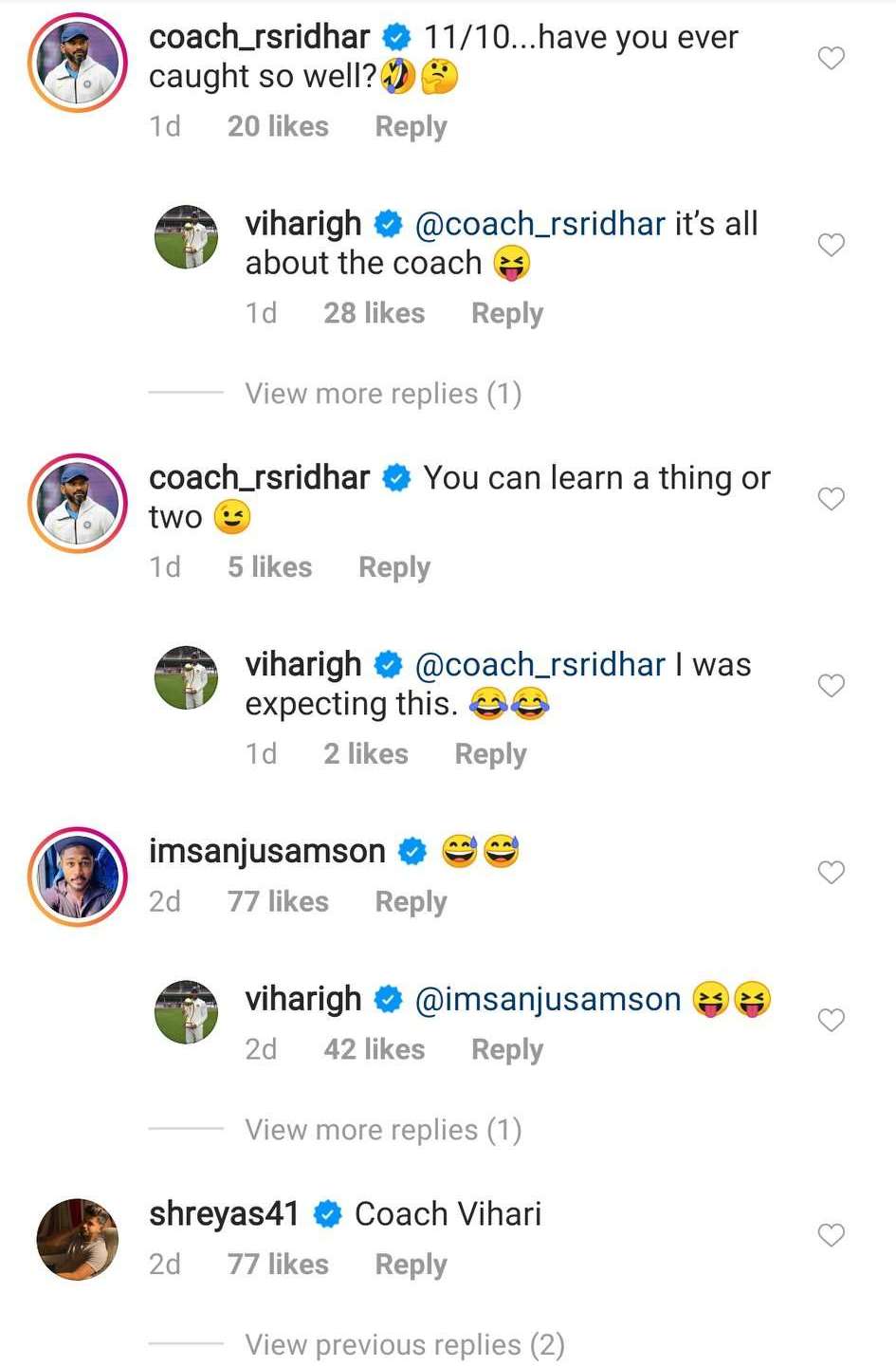 “11/10, Have you ever caught so well, You can learn a thing or two,” commented India’s fielding coach, R Sridhar. “I was expecting this, It’s all about the coach,” replied Vihari to Sridhar’s comment.