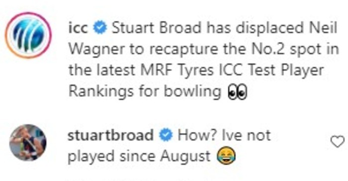 But when the ICC released their rankings, Broad managed to replace Wagner to capture the second position. This made even Broad surprised as he commented on ICC’s official Instagram handle. He responded in a cheeky way and asked: “How? I’ve not played since August.”