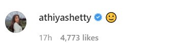 Athiya did not write a word but dropped a smile emoji in the comments section.