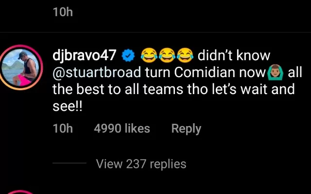 “Didn’t know Stuart Broad turn comedian now. All the best to all teams tho. Let’s wait and see,” Bravo replied to ESPNcricinfo‘s Instagram post.