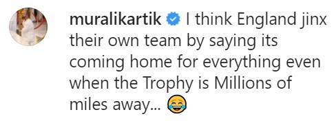 “I think England jinx their own team by saying it’s coming home for everything even when the Trophy is Millions of miles away,” wrote Kartik in the comment section.