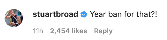 Reacting to the news, England pacer Stuart Broad on his Instagram wrote: “Year Ban for that?”