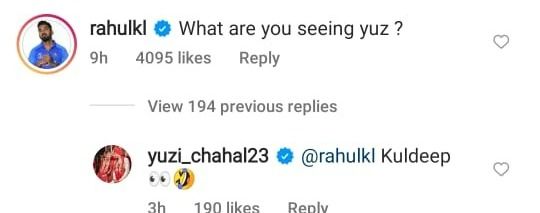 Meanwhile, Rahul also jumped into the conversation section and left a funny question for Chahal, mentioning, “What are you saying Yuz?” The leg-spinner was quick enough to come up with a comical response as he replied: “Kuldeep Yadav”.