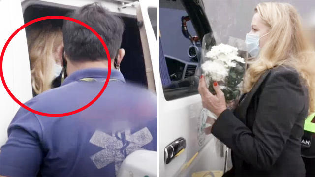 The woman, identified as Barbara, can be seen carrying a bunch of flowers when she entered the ambulance and stayed with Warne’s corpse for around 40 seconds.