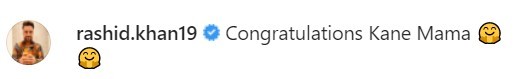 “Congratulations Kane Mama,” commented Williamson’s former SRH teammate and Afghanistan star spinner Rashid Khan.