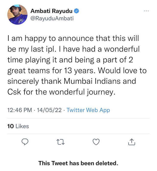 Chennai Super Kings (CSK) batter Ambati Rayudu created a buzz on social media when he tweeted that the current Indian Premier League (IPL) edition would be his last.