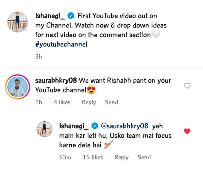Soon the video was bombarded with comments from her fans. Among many, one of her followers expressed his desire to see Rishabh Pant on the YouTube channel. “We want Rishabh Pant on your YouTube channel,” wrote the Instagram user.
