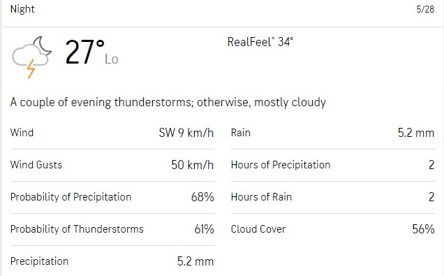 When it comes to the weather conditions of the much-awaited final game, there is a 40% chance of rain during the evening. It is also expected that there will be around 2 hours of scattered rainfall in the city. AccuWeather forecasts showers and as the evening progresses and the sun sets, gusts of wind at speeds of 50kmph are expected to accompany the rain.
