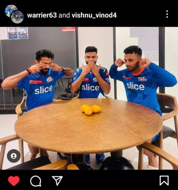 Not only this, some Mumbai players also joined the trend and trolled Naveen. MI players, Kumar Kartikeya, Vishnu Vinod, and Sandeep Warrier captured a photo together at the dining table, with a prominent display of mangoes in the frame.