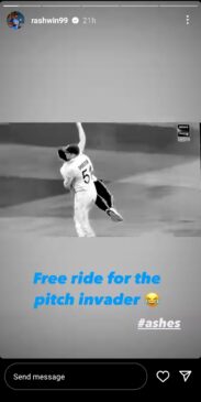 The off-spinner first posted the video on his Instagram story and captioned it “Free ride for the pitch invader.”