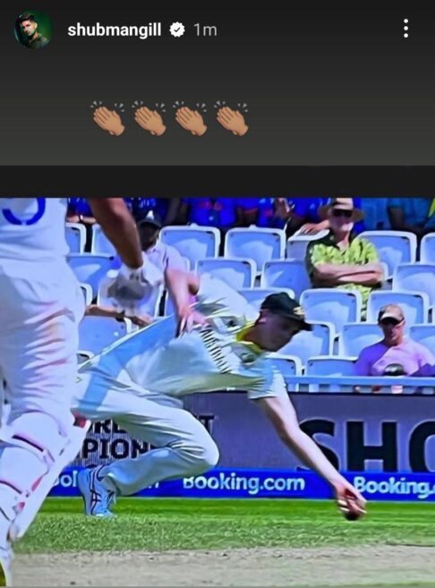 The verdict did not go down well with Gill as he went back to the dressing room in frustration. After the end of fourth day’s play, Gill expressed his dissatisfaction as he shared the photo of the catch taken by Green on his Instagram stories, using a ‘clap’ emoji as a sarcastic comment. Subsequently, the Indian star took to Twitter and posted the same photo accompanied by two ‘lens’ emojis and one ‘facepalm’ emoji.