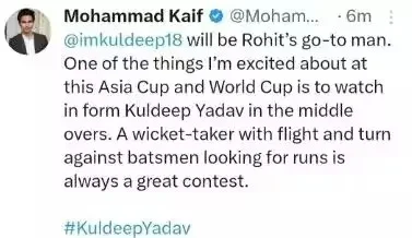 Kaif’s tweet read, “Kuldeep Yadav will be Rohit’s go-to man. One of the things I’m excited about at this Asia Cup and World Cup is to watch in-form Kuldeep Yadav in the middle overs. A wicket-taker with flight and turn against batsmen looking for runs is always a great contest.”