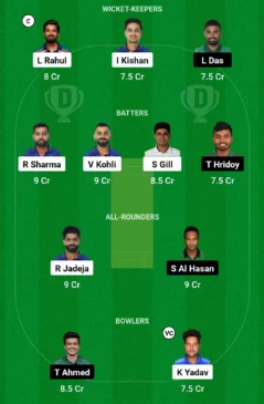 - Batters: Rohit Sharma, Virat Kohli, Shubman Gill, Towhid Hridoy
