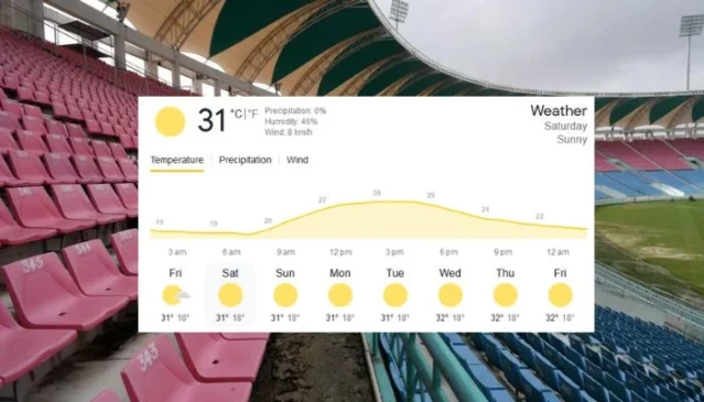 The weather conditions are ideal for a pleasant day with no rain expected (0% chance). The temperature is expected to be around 31 degrees Celsius, and humidity levels are anticipated to be approximately 46%. The gentle breeze is forecasted to blow at a speed of 8 kilometres per hour.
