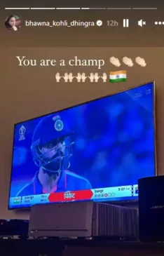 Amidst the overwhelming acclaim, Kohli’s sister, Bhawana Kohli Dhingra, took to Instagram to share her heartfelt emotions about her brother’s stellar performance. In a succinct yet touching Instagram story, she conveyed her pride and admiration, writing, “You are a champ.” This four-word message encapsulated the immense pride and support she felt for her sibling.