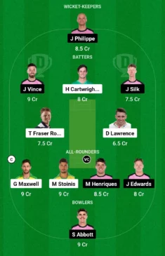 Sydney Sixers: James Vince, Josh Philippe (wk), Steven Smith, Jack Edwards, Kurtis Patterson, Moises Henriques (c), Hayden Kerr, Tom Curran, Sean Abbott, Ben Dwarshuis, Jackson Bird, Todd Murphy, Izharulhaq Naveed, Joel Davies, Mitchell Perry, Jordan Silk, Daniel Hughes, Steve O’Keefe
