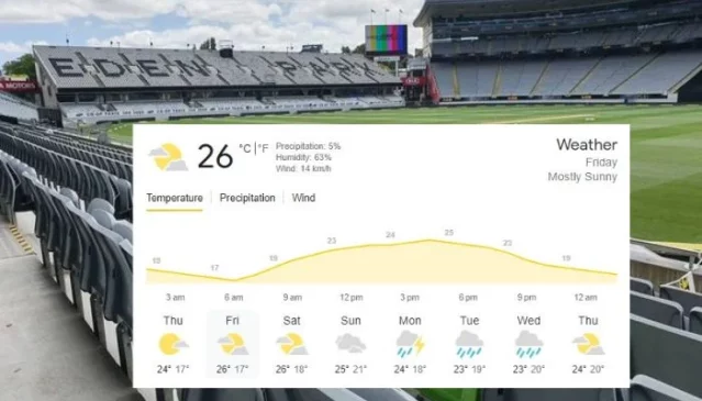 The weather forecast for the upcoming New Zealand vs Pakistan match in Auckland suggests a favorable outlook for a complete game, as it is expected to be mostly sunny with only a 5% chance of precipitation. The humidity is projected to be around 63%, and the wind speed is forecasted to be 14 kilometers per hour.