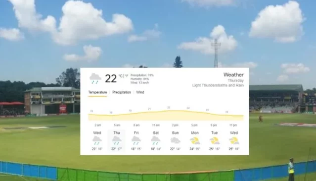 The weather prognosis for the Zimbabwe versus Ireland encounter in Harare suggests a 70% chance of rain. Anticipated humidity levels are set at 84%, with the projected wind speed reaching 13 kilometers per hour.