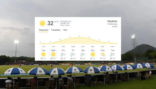The weather for the second T20I is expected to be clear with no chance of precipitation. The temperature is projected to reach around 32 degrees Celsius, accompanied by a humidity level of approximately 59%. Additionally, the wind is forecasted to blow at a speed of about 13 kmph.
