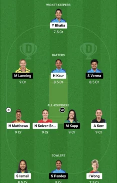 Mumbai Indians Women: Hayley Matthews, Yastika Bhatia (wk), Nat Sciver-Brunt, Harmanpreet Kaur (c), Amelia Kerr, Amanjot Kaur, Pooja Vastrakar, Shabnim Ismail, Jintimani Kalita, Amandeep Kaur, Saika Ishaque, Chloe Tryon, Humaira Kazi, Issy Wong, Priyanka Bala, S Sajana, Keerthana Balakrishnan, Fatima Jaffer