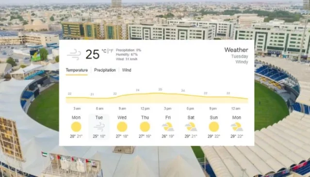 The weather outlook for the forthcoming match in Sharjah indicates windy conditions but minimal chances of rain, with a 0% probability of precipitation. The wind speed is expected to reach 31 km/h. Temperatures are forecasted to remain at approximately 25 degrees Celsius, accompanied by a humidity level of around 67%.