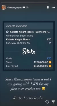“Since @ovorajuju (Sureshkumar Subramaniam) team is out I am going with KKR for my first ever cricket bet (laughing with tears emoji) korbo lorbo jitbo,” read the text on Drake’s story with a screenshot of his bet on ‘Stake’.