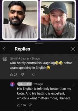 During the interview, a fan attempted to mock Babar’s English, writing in the YouTube comments section, “ABD hardly control his laughing. Babar Azam speaking in English,” accompanied by tears of joy emojis. De Villiers, known for his sportsmanship, responded sharply to the troll. De Villiers wrote, “His English is infinitely better than my Urdu. And his batting is excellent, which is what matters more, I believe.” This response from the Proteas legend highlighted the importance of respecting players for their skills and contributions to the game, rather than their language abilities.
