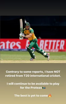 “Contrary to reports, I have not retired from T20 international cricket. I will continue to be available for the Proteas. The best is yet to come,” Miller wrote, putting to rest any doubts about his commitment to the South African team.