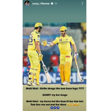 Suryakumar’s humorous caption about Dhoni’s conversation with Dube strikingly mirrors a scene from the 2016 biopic MS Dhoni: The Untold Story. In the film, a young Dhoni, played by Sushant Singh Rajput, has a similar exchange with a teammate from Bihar during a local match. When Dhoni asks if his partner can handle the pressure of scoring, the teammate hesitantly says he’ll try. Dhoni, with his characteristic wit and confidence, replies that he’d rather take charge himself than leave it to chance, ensuring he doesn’t get run out. This cinematic moment beautifully captured Dhoni’s early leadership and self-belief, traits that Suryakumar’s Instagram story reflects in the present day.