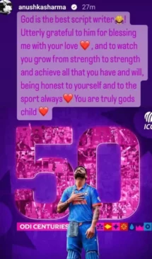 “God is the best scriptwriter! Utterly grateful to him for blessing me with your love, and to watch you grow from strength to strength and achieve all that you have and will, being honest to yourself and to the sport always. You are truly God’s child,” wrote Anushka on her Insta story.
