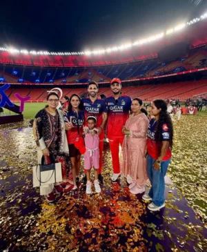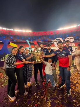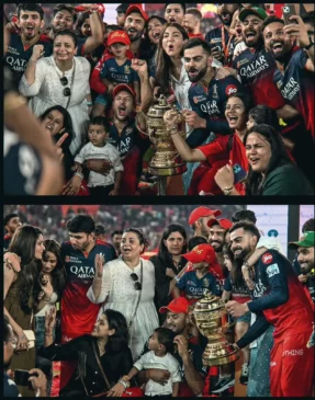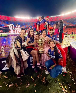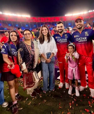 Amid all the jubilation, the most heartwarming scenes came from the dressing room and ground, where RCB players celebrated the historic win with their families. Virat Kohli was seen embracing his wife Anushka Sharma, both emotional and proud of the long-awaited success.