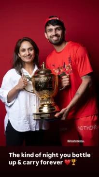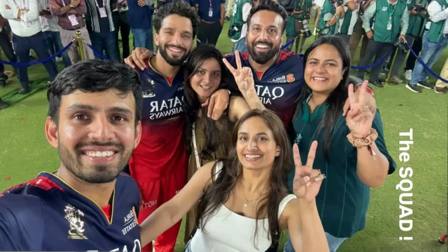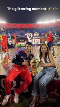 Bhuvneshwar Kumar, a key figure in RCB’s bowling unit, shared the joyous moment with his wife Nupur Nagar, while Jitesh Sharma posed for victory photos alongside his wife, both beaming with pride. These personal moments added a deeper emotional layer to the win, highlighting the sacrifices and support behind each player’s journey.