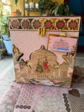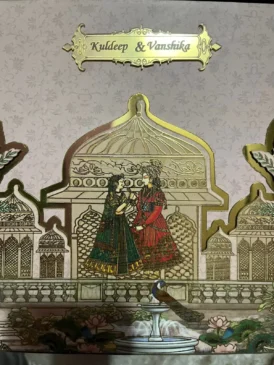 At the centre of the card, a beautifully engraved artwork shows a couple standing near a jharokha-style palace window. The figures, dressed in traditional red and green royal attire, resemble Radha and Krishna, symbolising eternal love and devotion. The background illustration showcases palace domes and latticed windows, reinforcing the regal theme. At the bottom of the card, the design shifts to a serene natural setting with blooming lotus flowers, a fountain, and a peacock, further enhancing its artistic appeal.